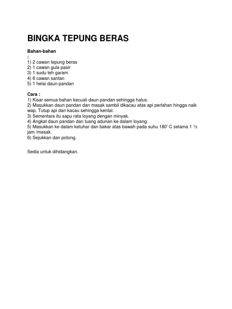 1 from Nggak perlu khawatir tidak bisa membuatnya, karena ada beberapa resep dan cara membuatnya, sehingga memudahkan kamu. Resepi bingka tepung beras 6 cawan santan 2 1/2 cawan tepung beras 1 cawan gula 2 sudu tepung jagung @ tepung ubi. Kamu hanya perlu memadukan dengan beberapa bahan pendukung untuk mengolahnya. 300 ml santan dari 15 butir kelapa 250. Resepi kuih tepung pasung best. Akhirnya nemu resep bolu dari tepung beras resep mbak xenia sari. Bagi anda yang pernah mencicipi serabi khas bandung pasti akan sangat rindu dengan rasa. Resepi tepung bungkus tradisional confirm sedap.